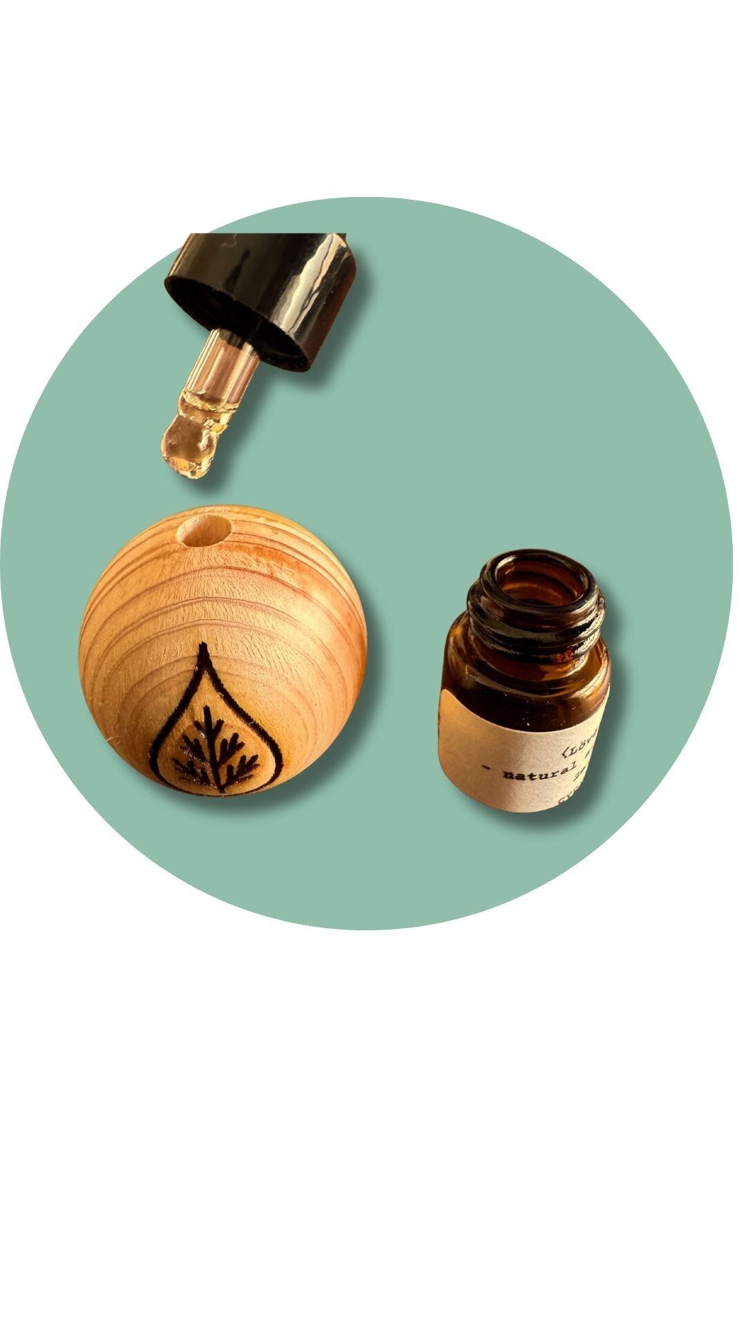ひのき玉にあらかじめ開けられたアロマ用の穴に、お好きな精油を数滴垂らしてご使用ください。